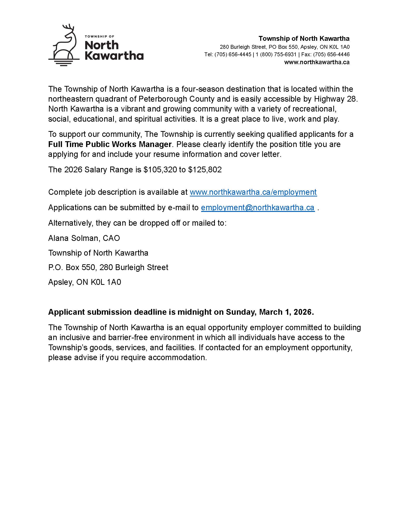 Full Time Public Works Manager Full Time Apsley Posted 5 hours ago Company Details Township of North Kawartha Website Apply Now × Apply Now Job Title: Job ID: Job URL: Your name (required) Your email (required) Your message Attach your resume (PDF, Max. 2MB) Δ