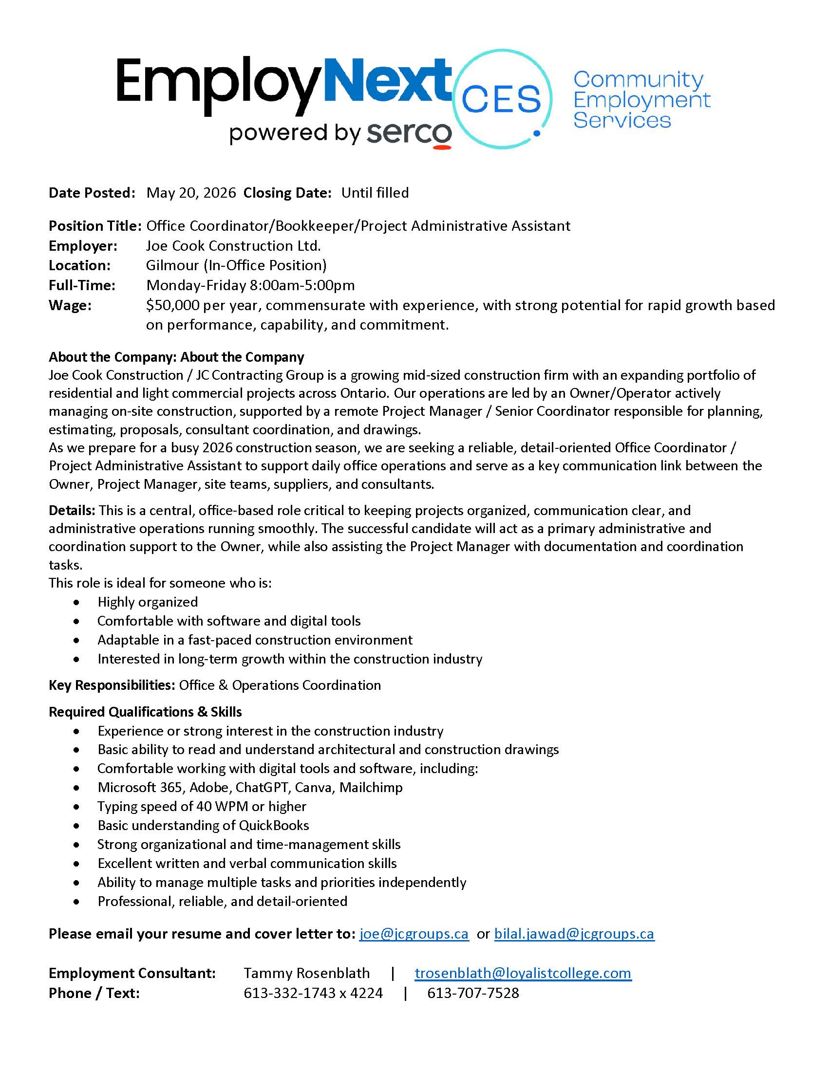Office Coordinator/Bookkeeper/Project Administrative Assistant Full Time Office and Administration Gilmour Posted 2 weeks ago Company Details Joe Cook Construction Ltd. Apply Now × Apply Now Job Title: Job ID: Job URL: Your name (required) Your email (required) Your message Attach your resume (PDF, Max. 2MB) Δ
